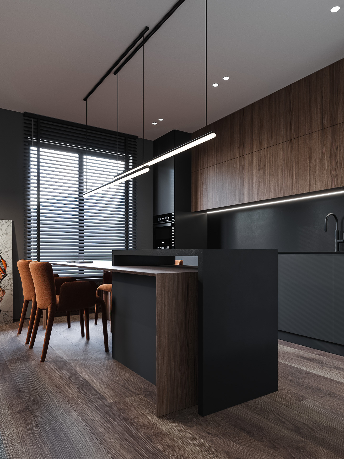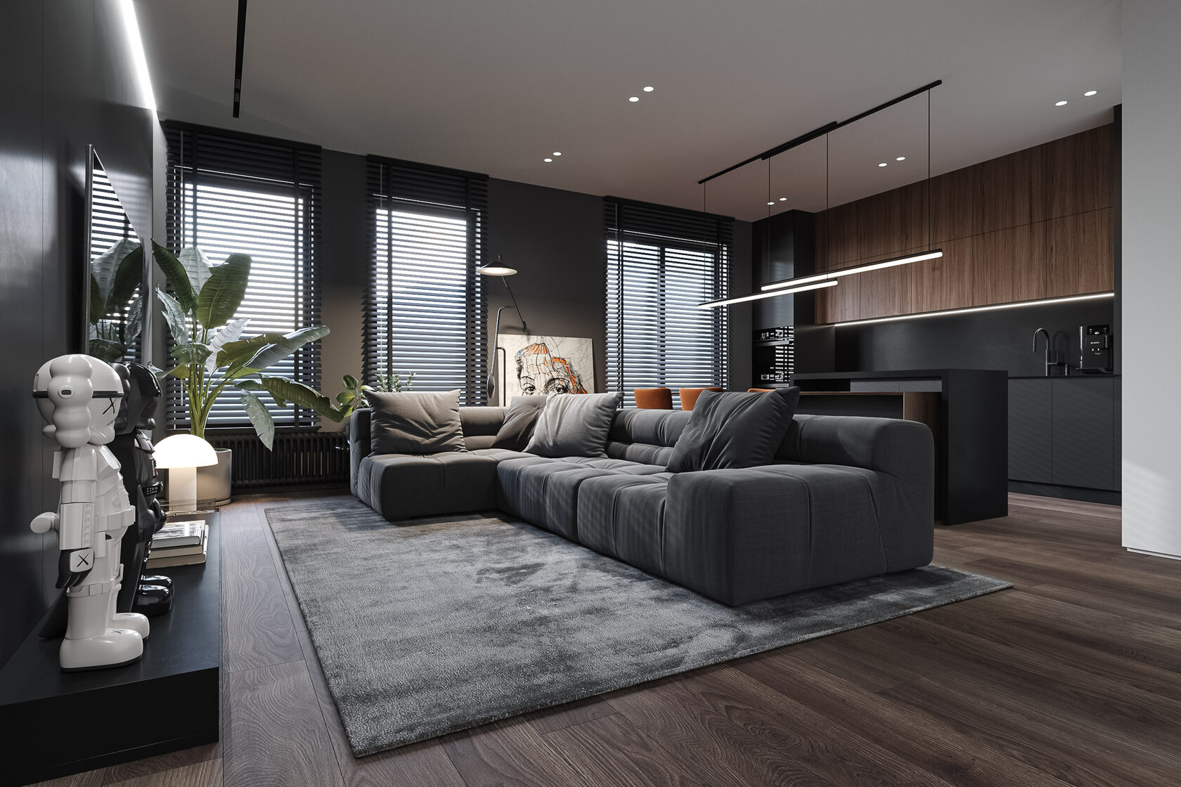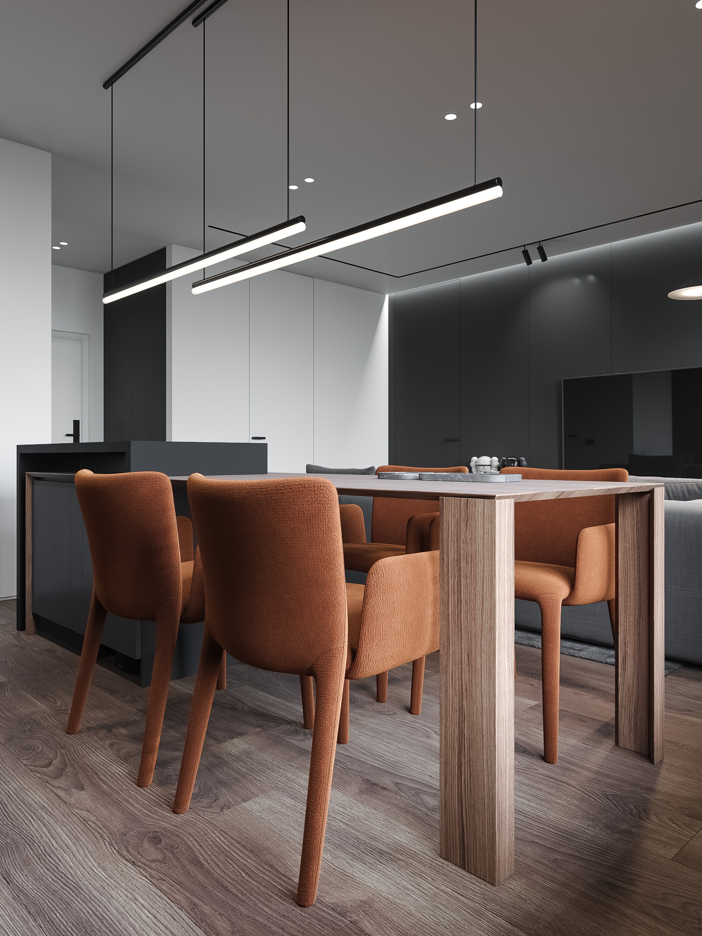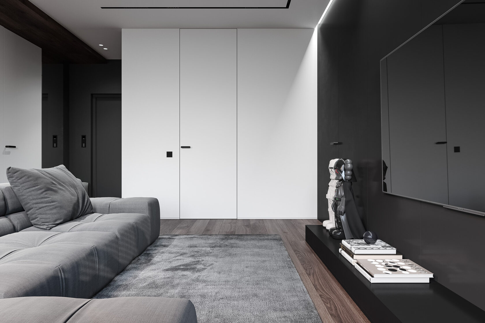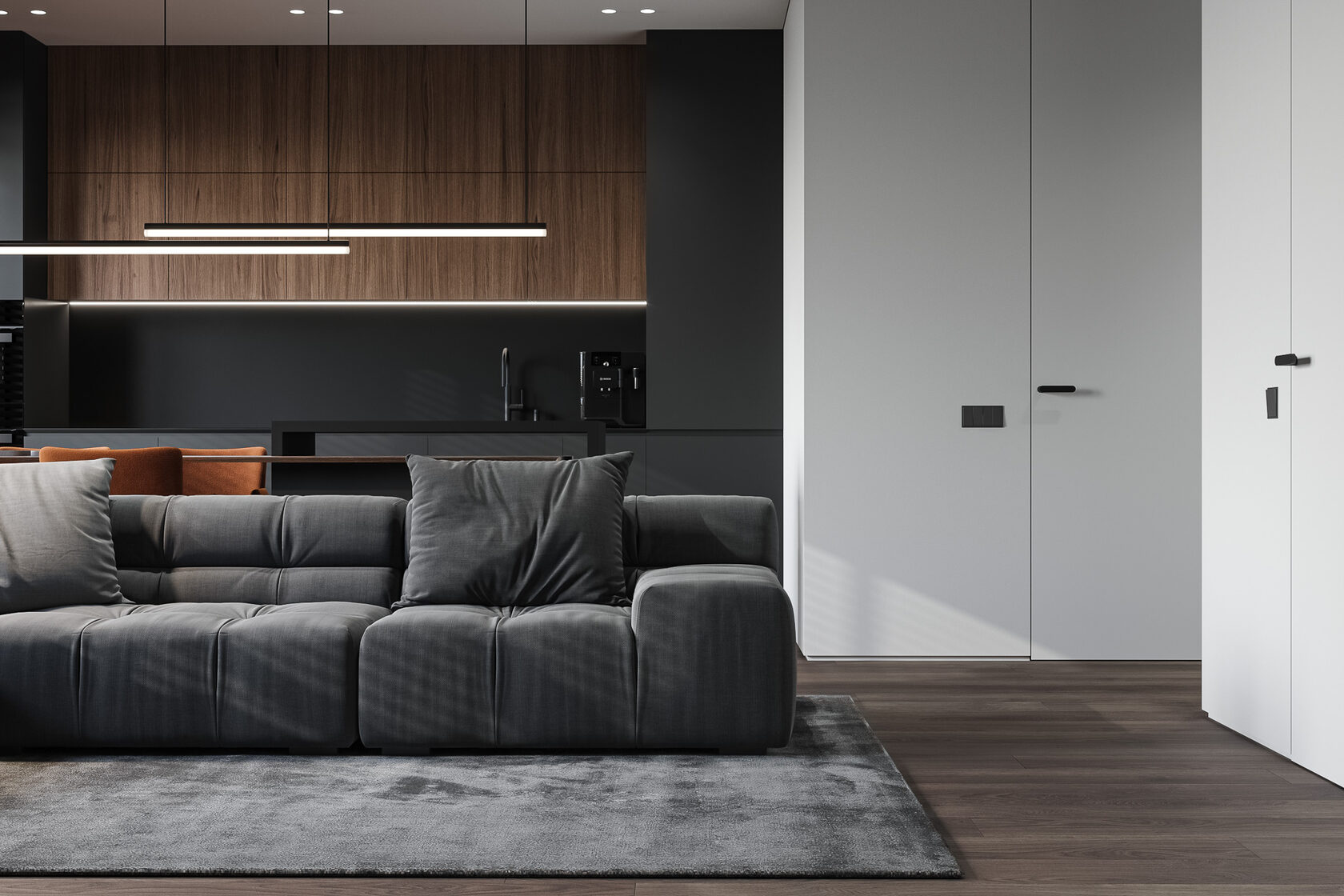 The interior of this apartment was designed for a young couple. The apartment is done in a modern style with hints of minimalism. The dominant color scheme of the interior is dark tones. Designer furniture, decorative panels, elegant tall doors, and minimalist lighting blend harmoniously here.