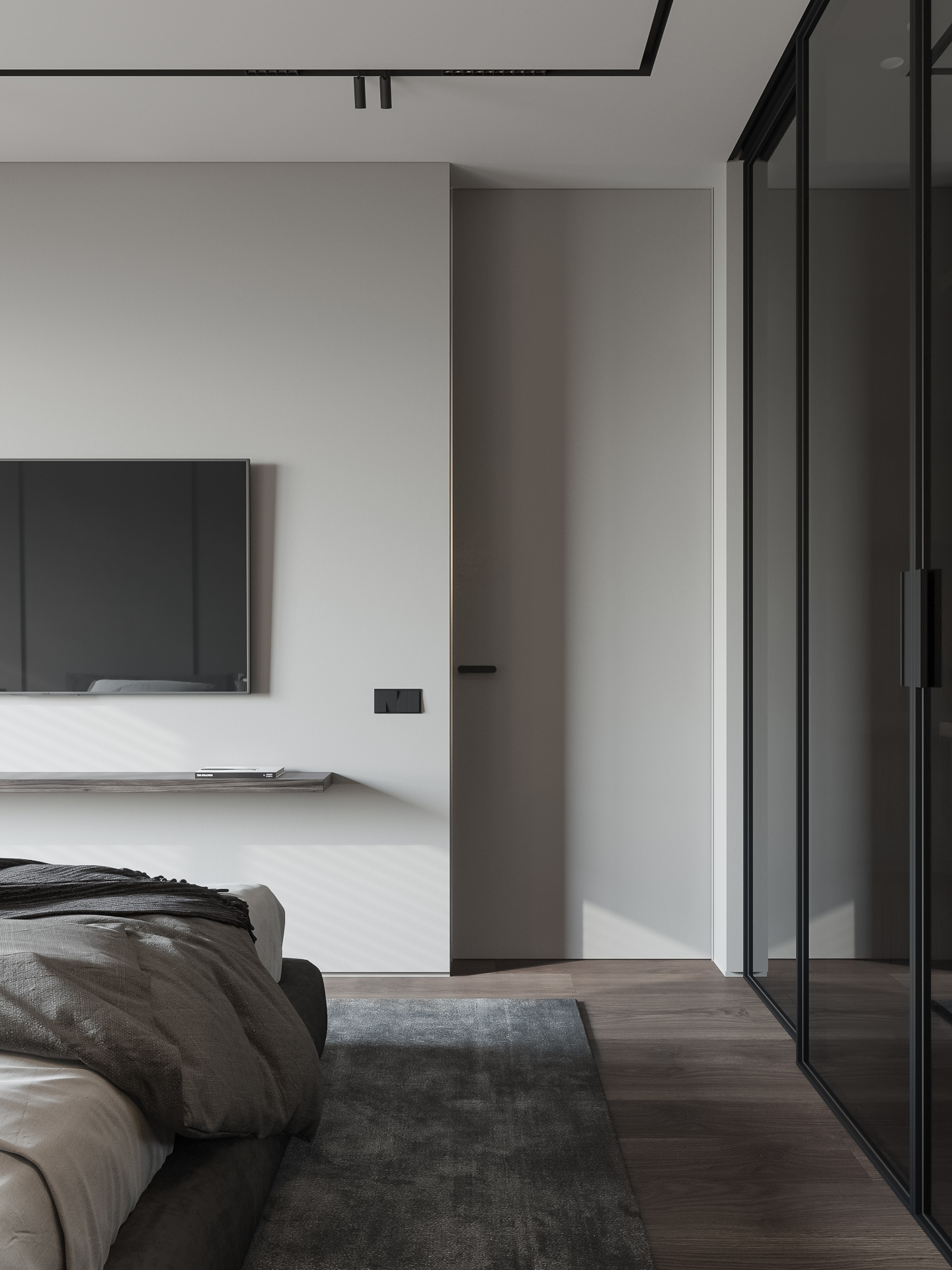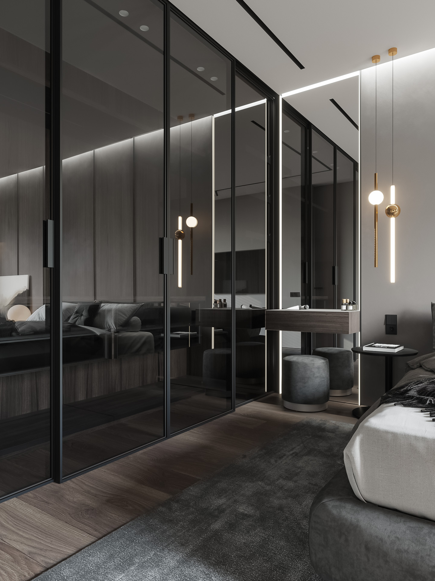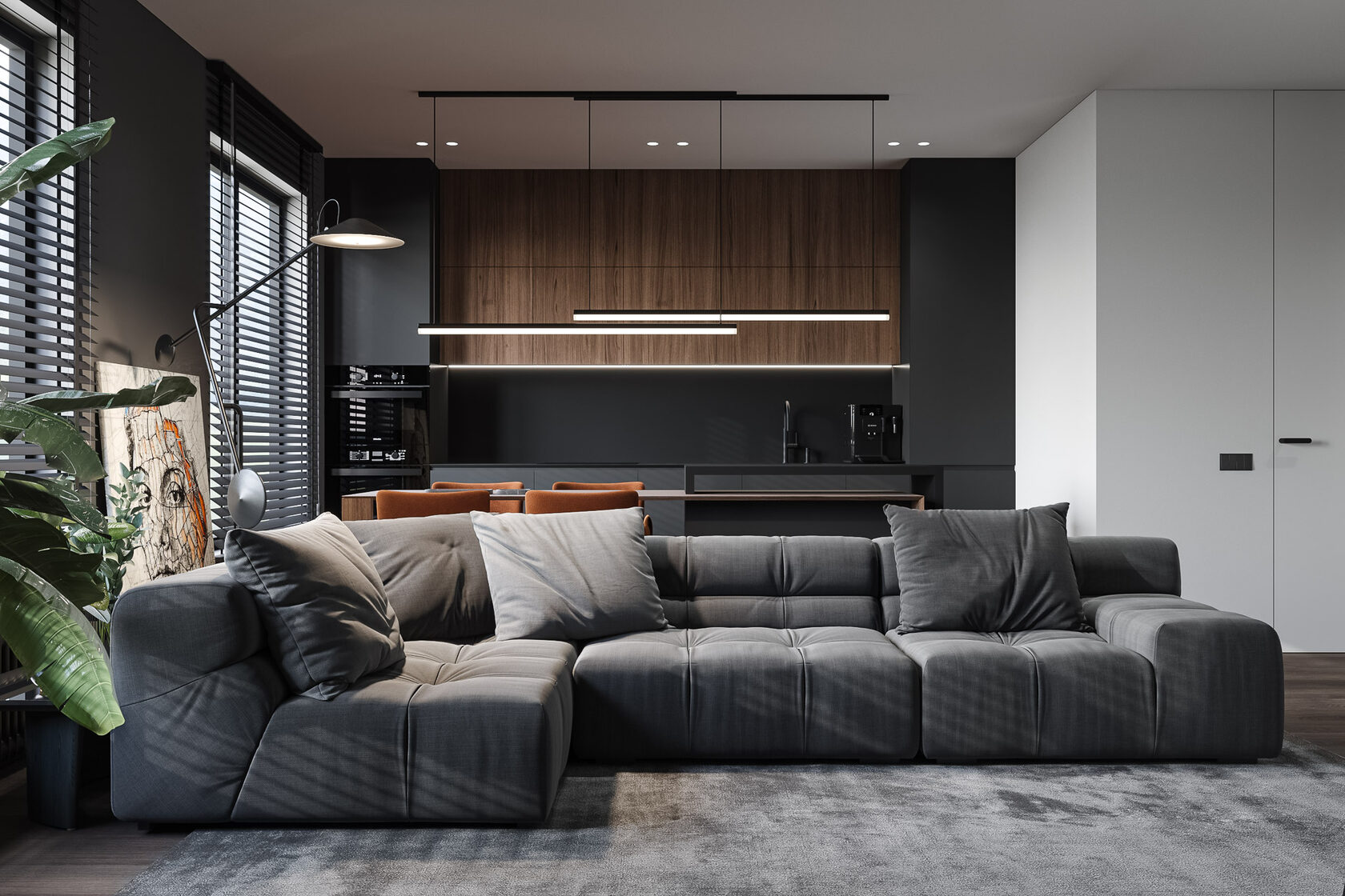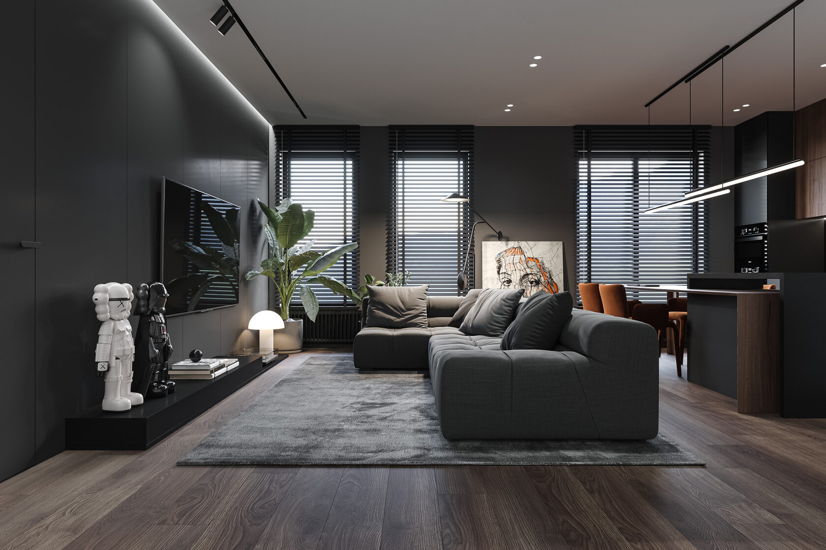 The interior of this apartment was designed for a young couple. The apartment is done in a modern style with hints of minimalism. The dominant color scheme of the interior is dark tones. Designer furniture, decorative panels, elegant tall doors, and minimalist lighting blend harmoniously here.