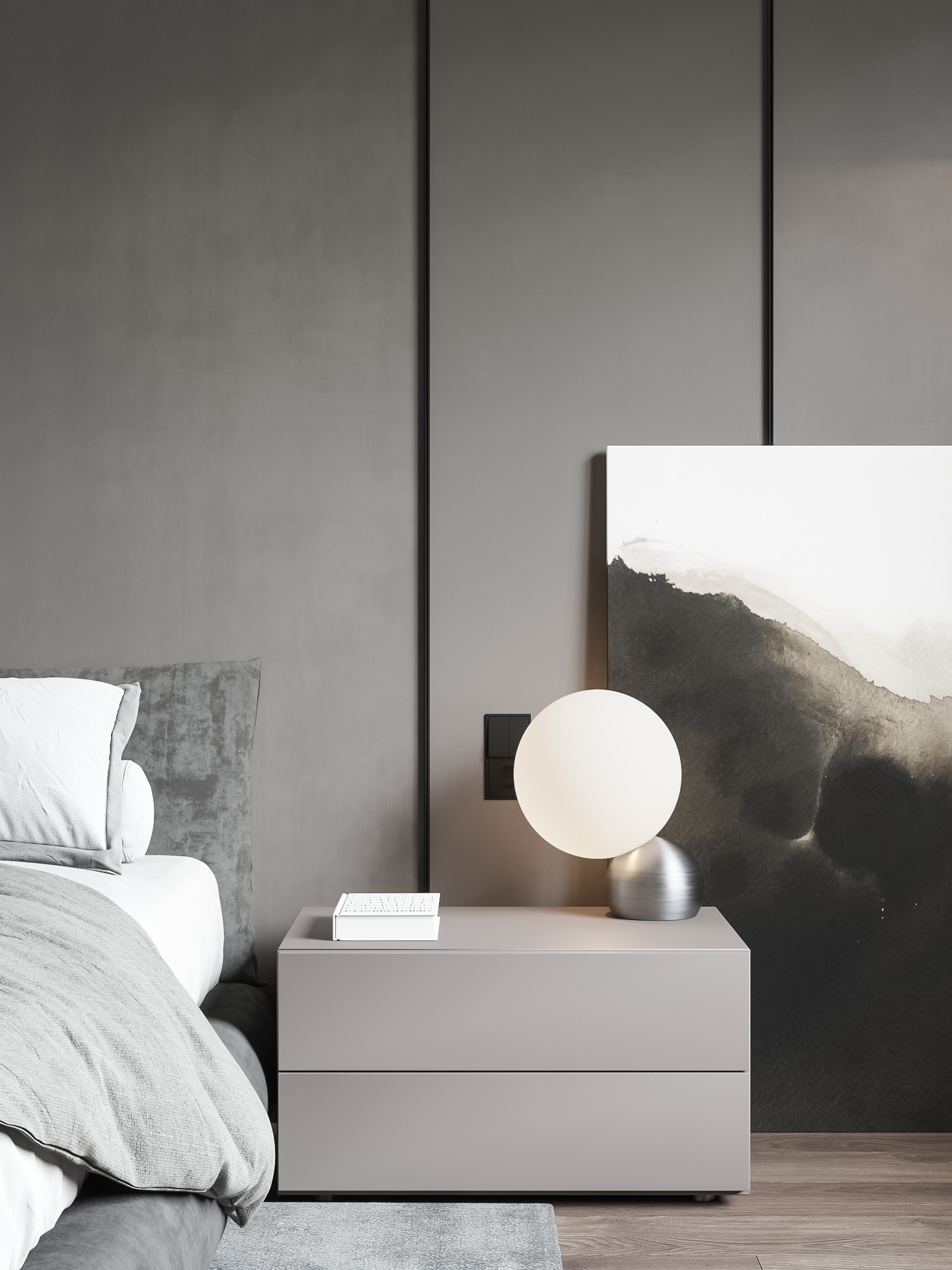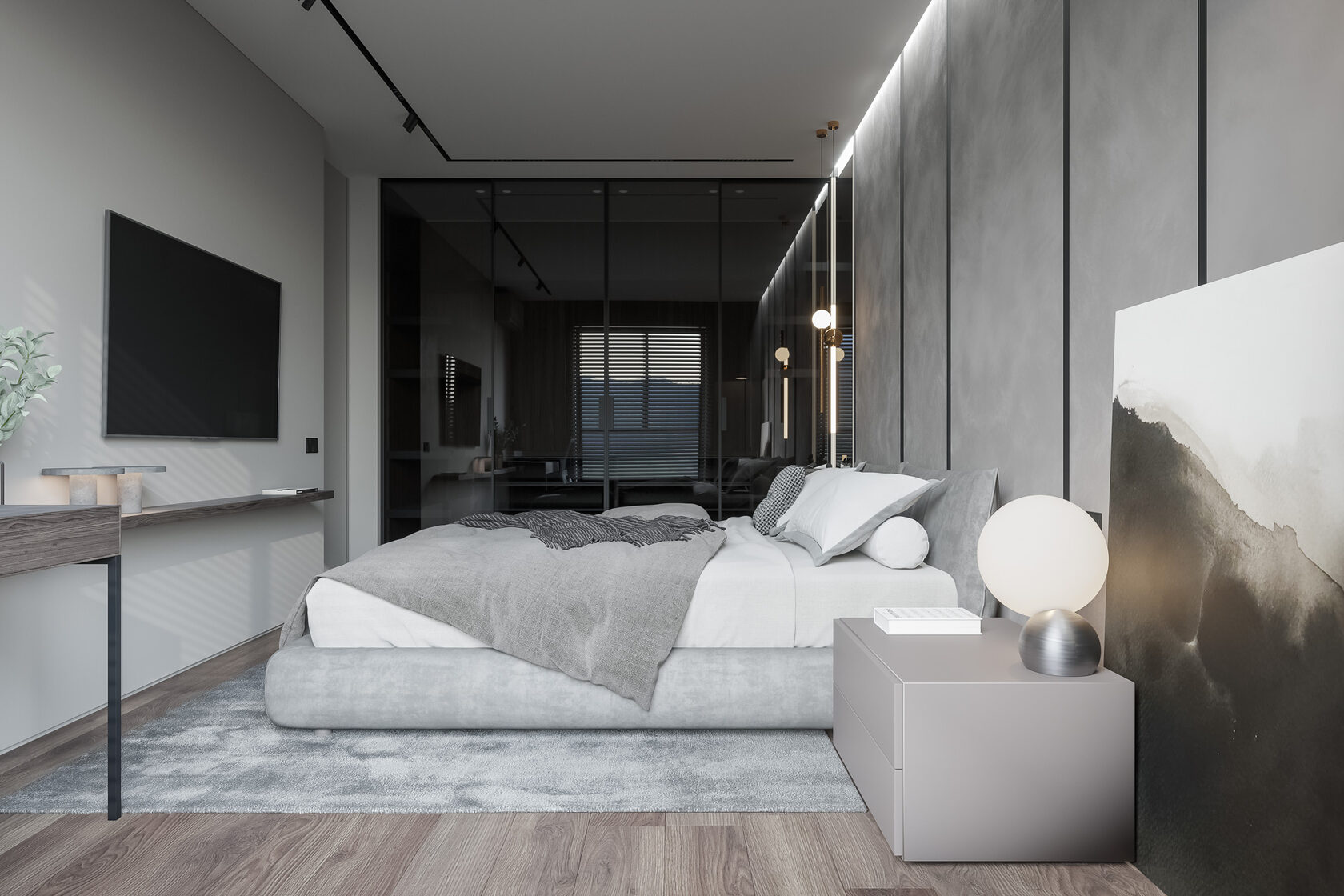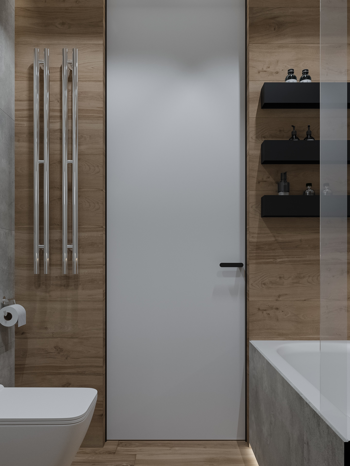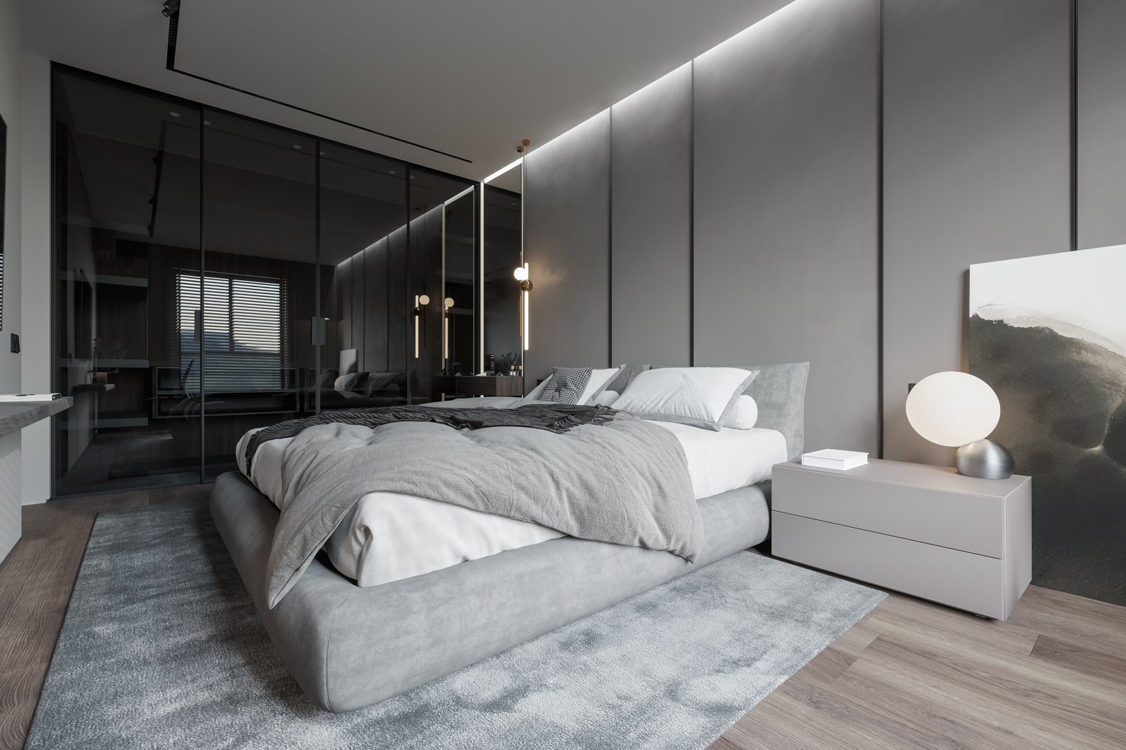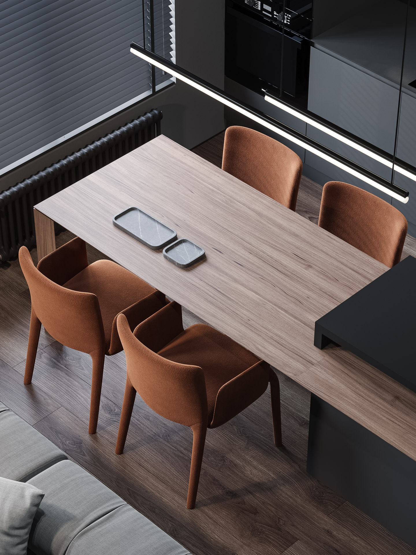 The interior of this apartment was designed for a young couple. The apartment is done in a modern style with hints of minimalism. The dominant color scheme of the interior is dark tones. Designer furniture, decorative panels, elegant tall doors, and minimalist lighting blend harmoniously here.