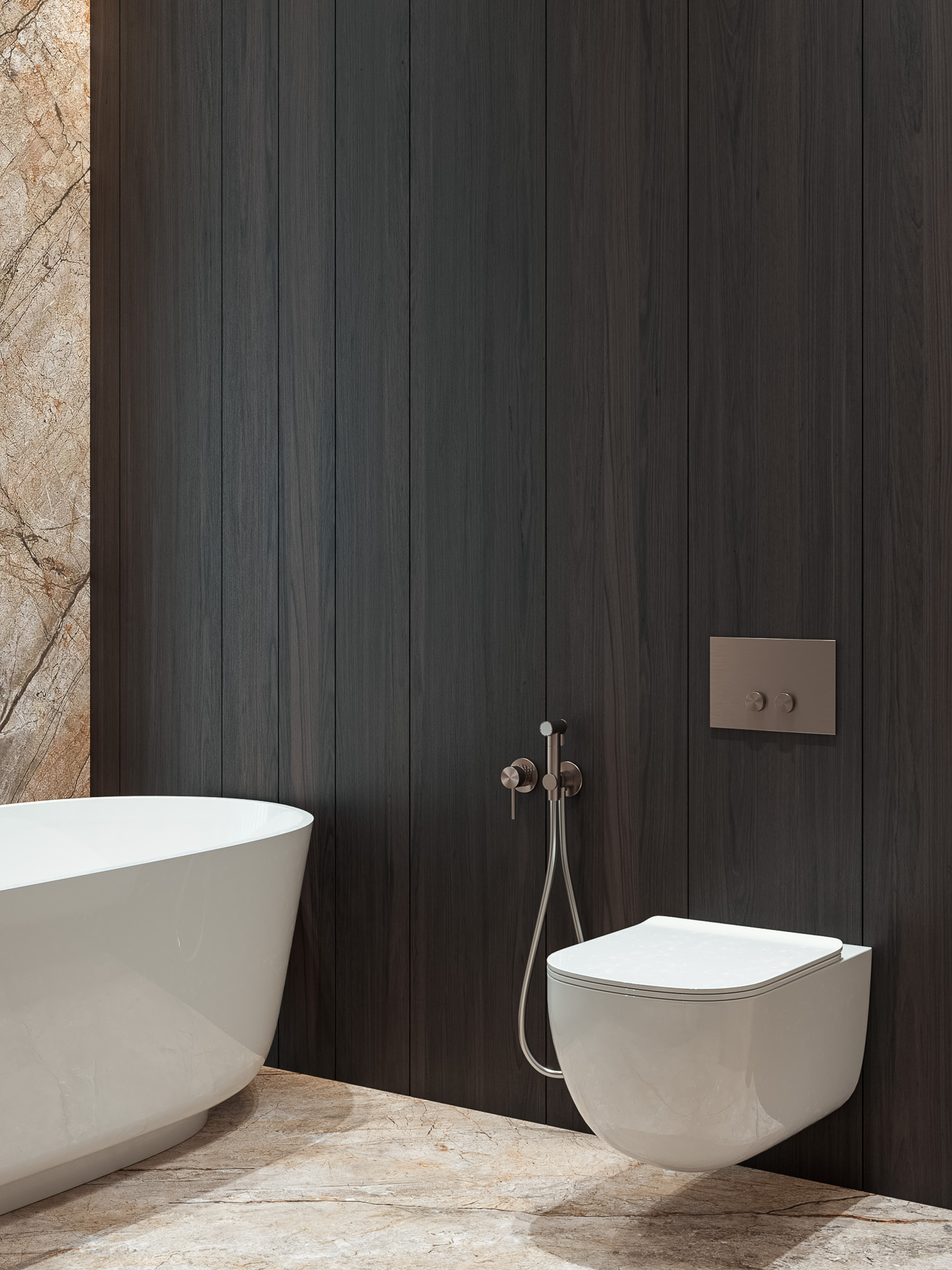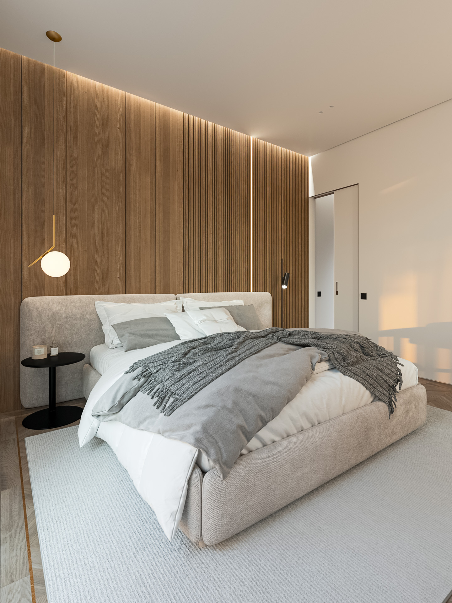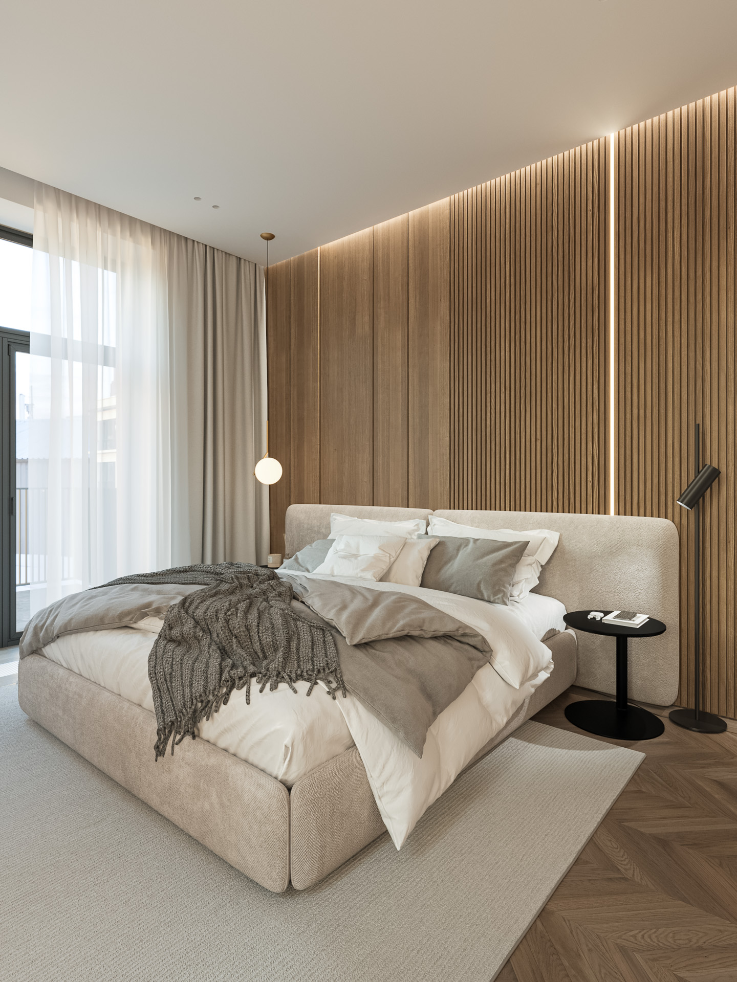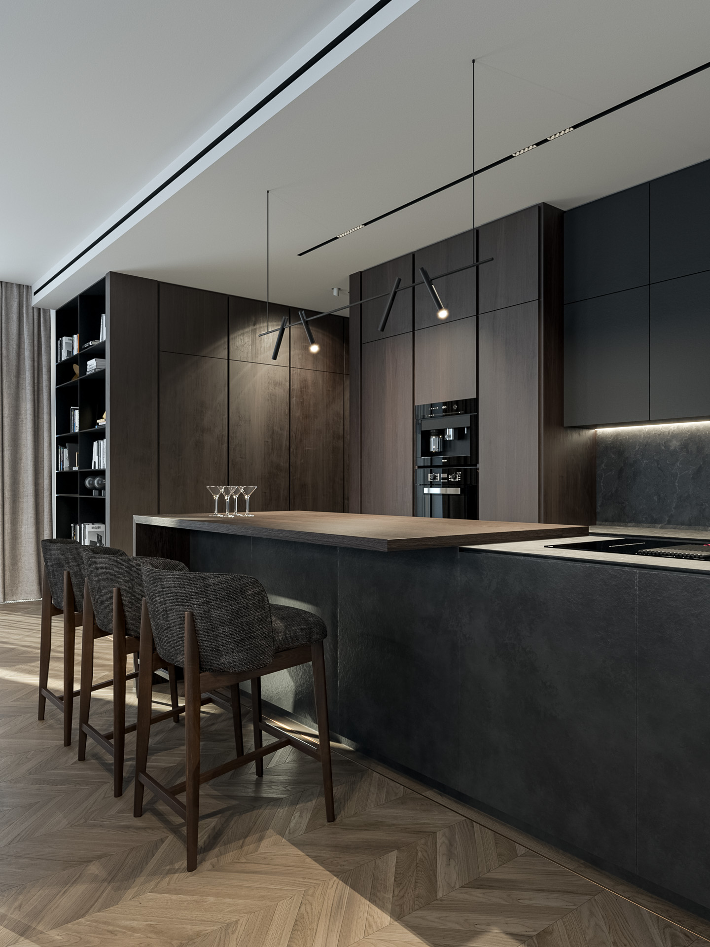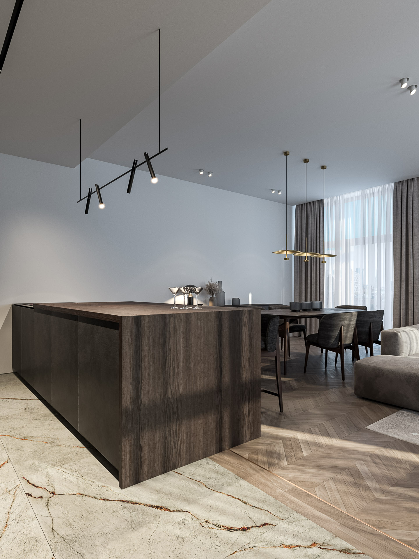 The French oak parquet flooring adds a touch of elegance and softens the overall ambiance. The bathrooms feature large-format ceramic tiles in combination with natural veneer panels. The kitchen island boasts a functional workspace, a cooktop surface, and a small bar area.