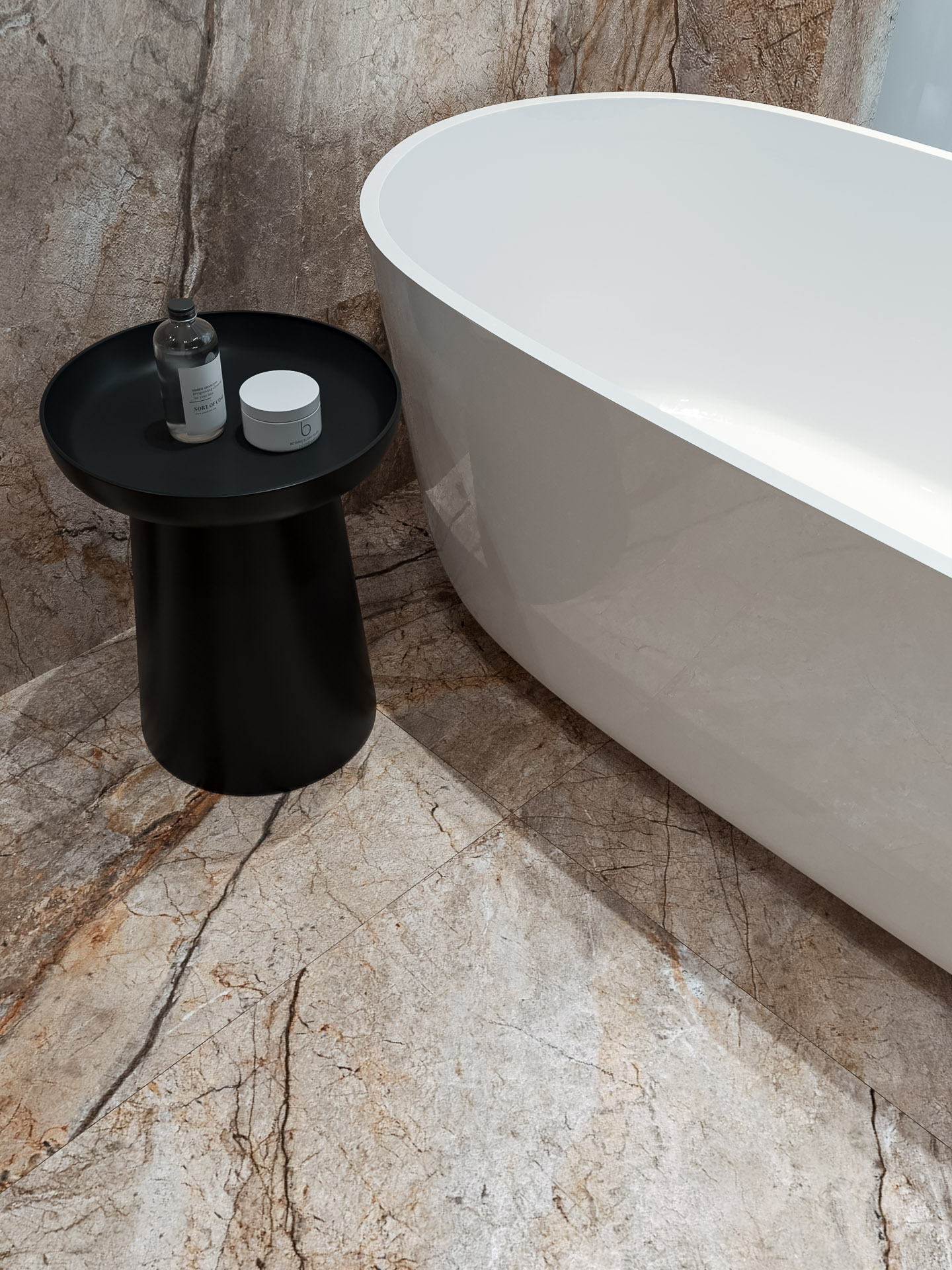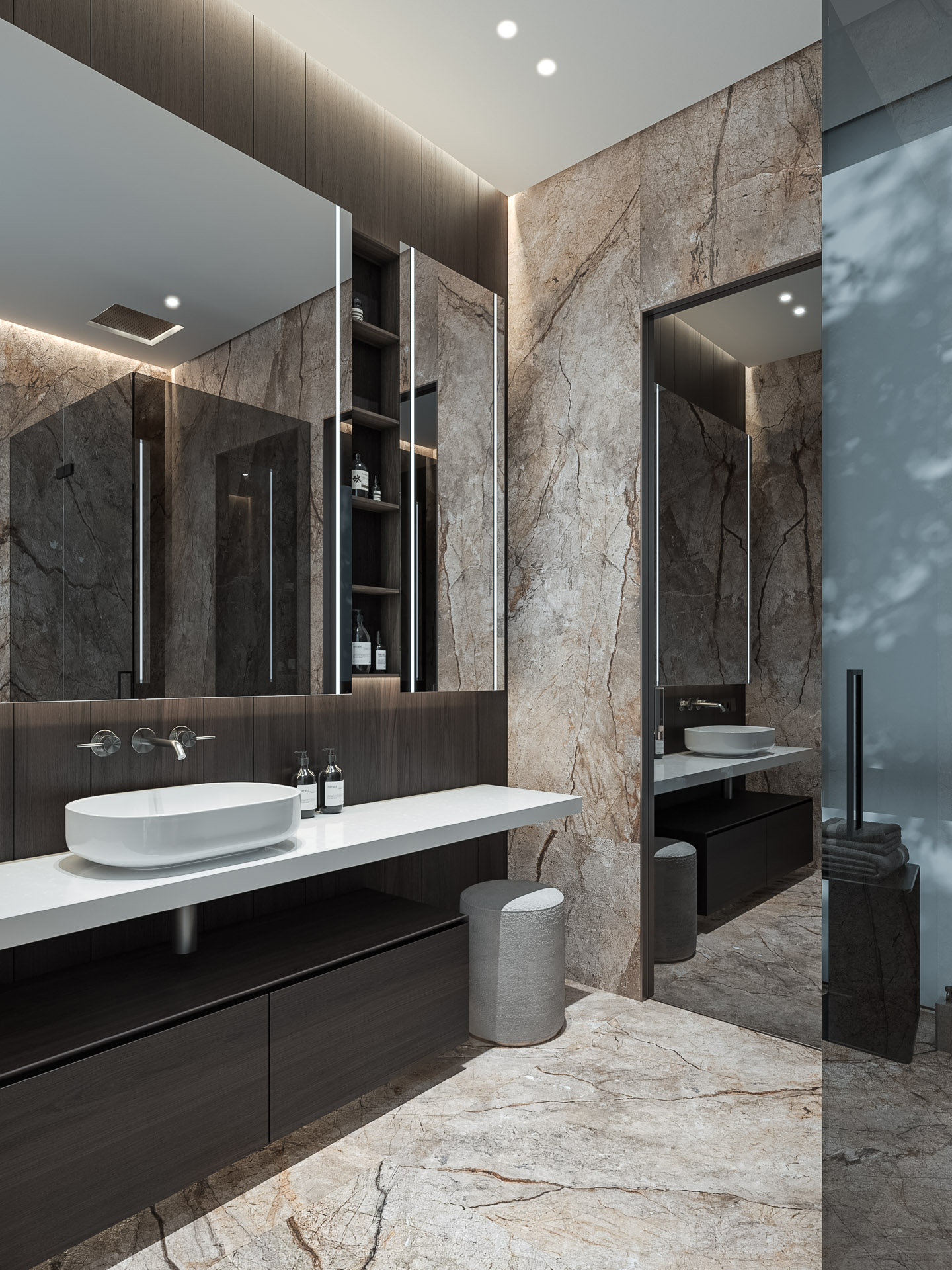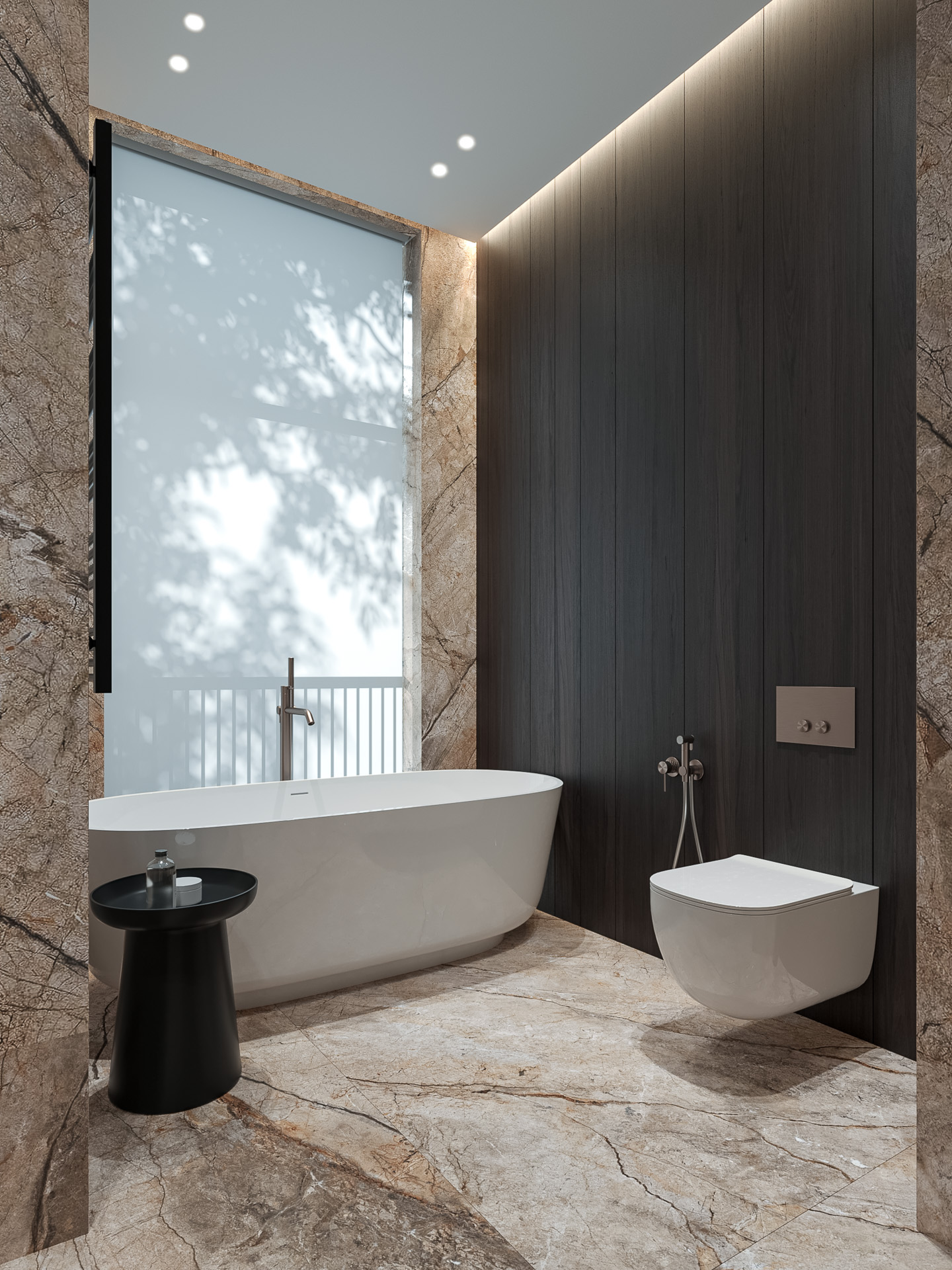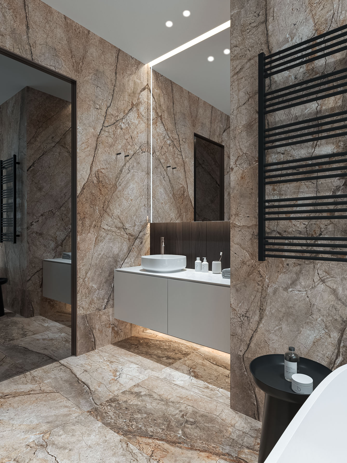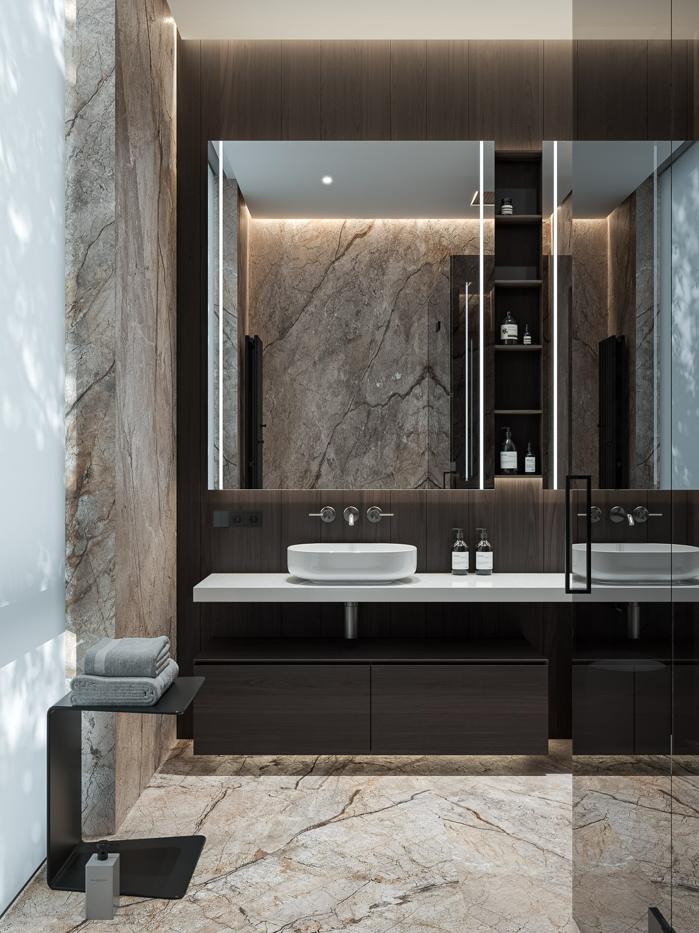 The French oak parquet flooring adds a touch of elegance and softens the overall ambiance. The bathrooms feature large-format ceramic tiles in combination with natural veneer panels. The kitchen island boasts a functional workspace, a cooktop surface, and a small bar area.