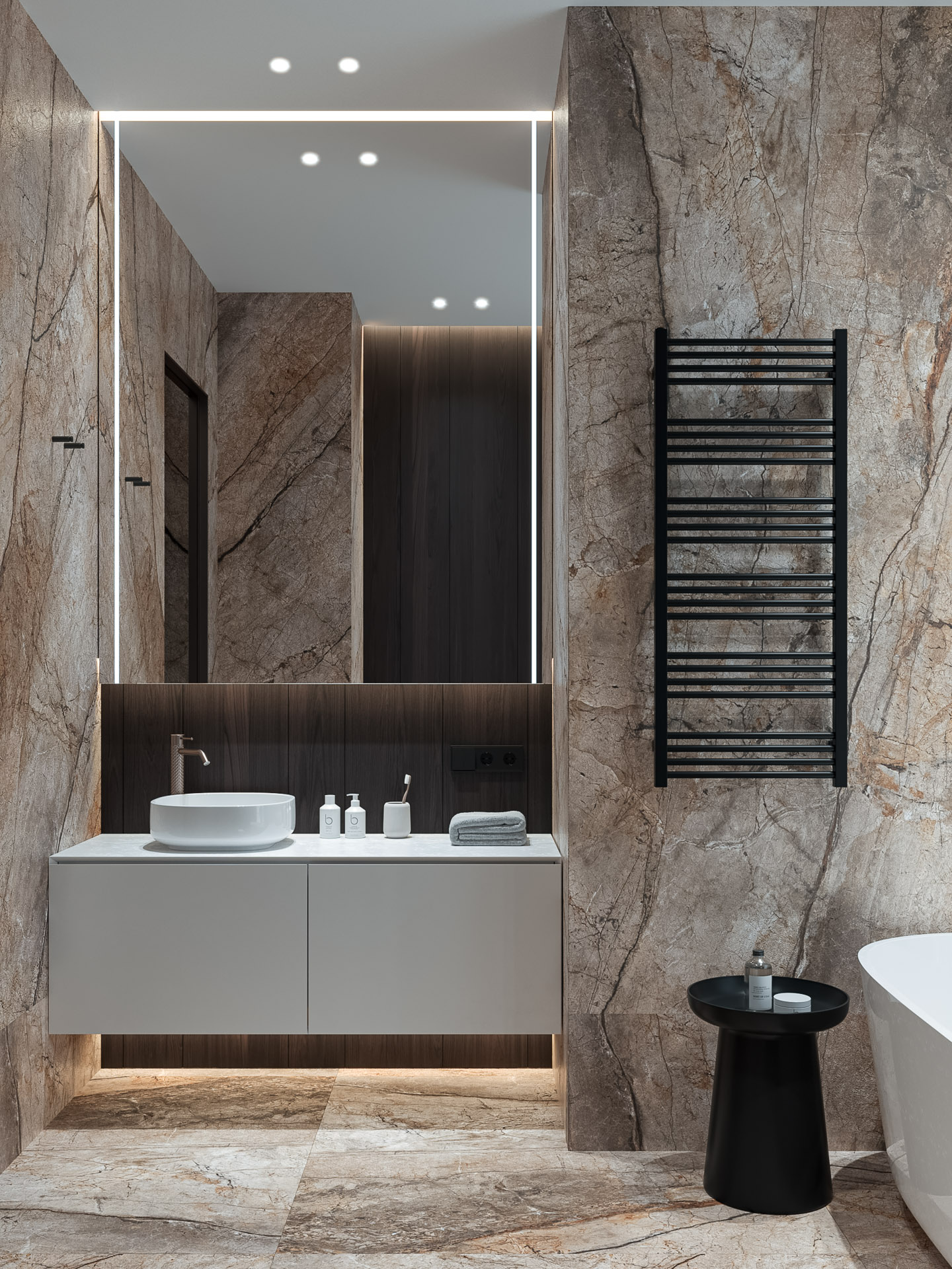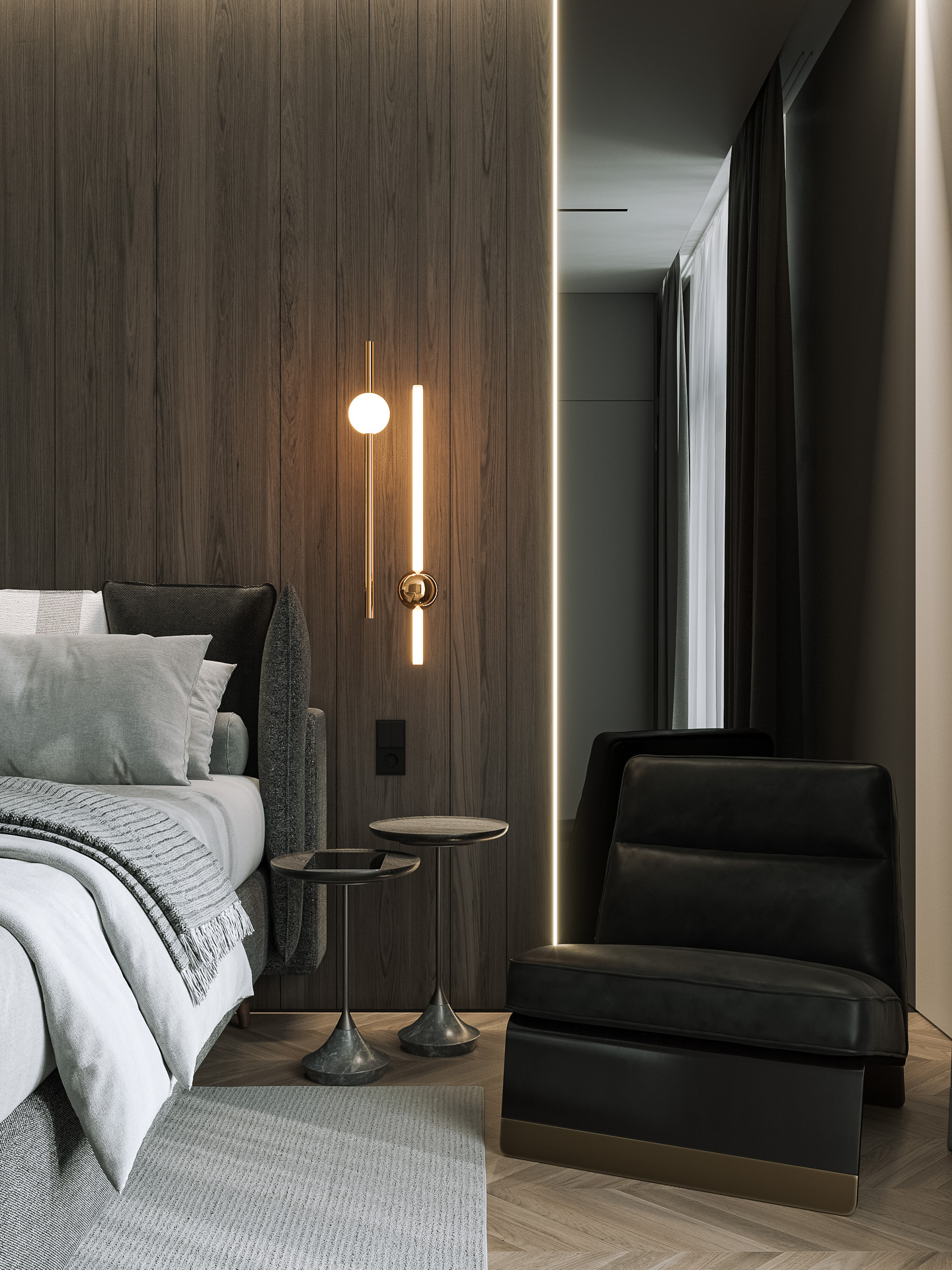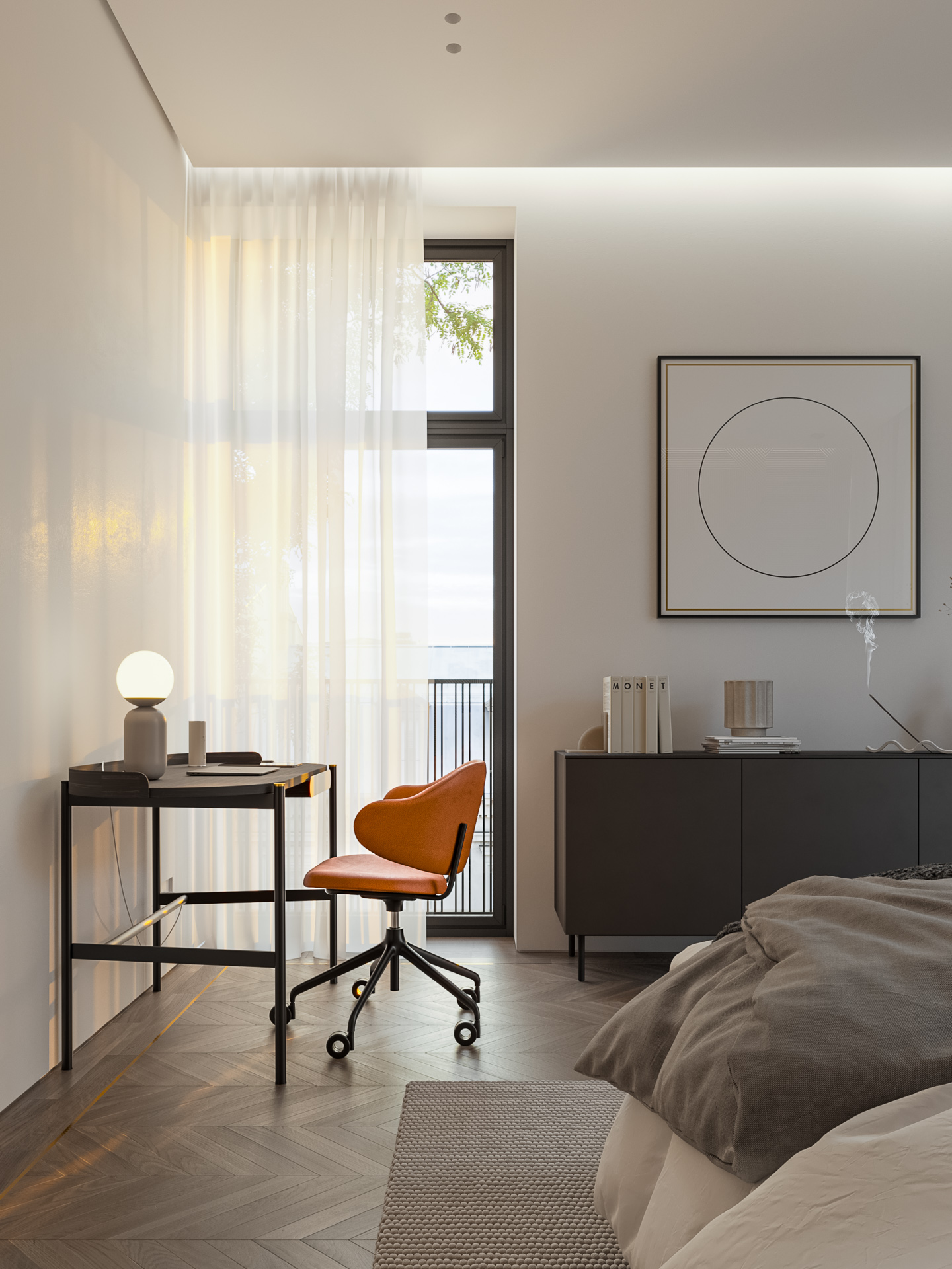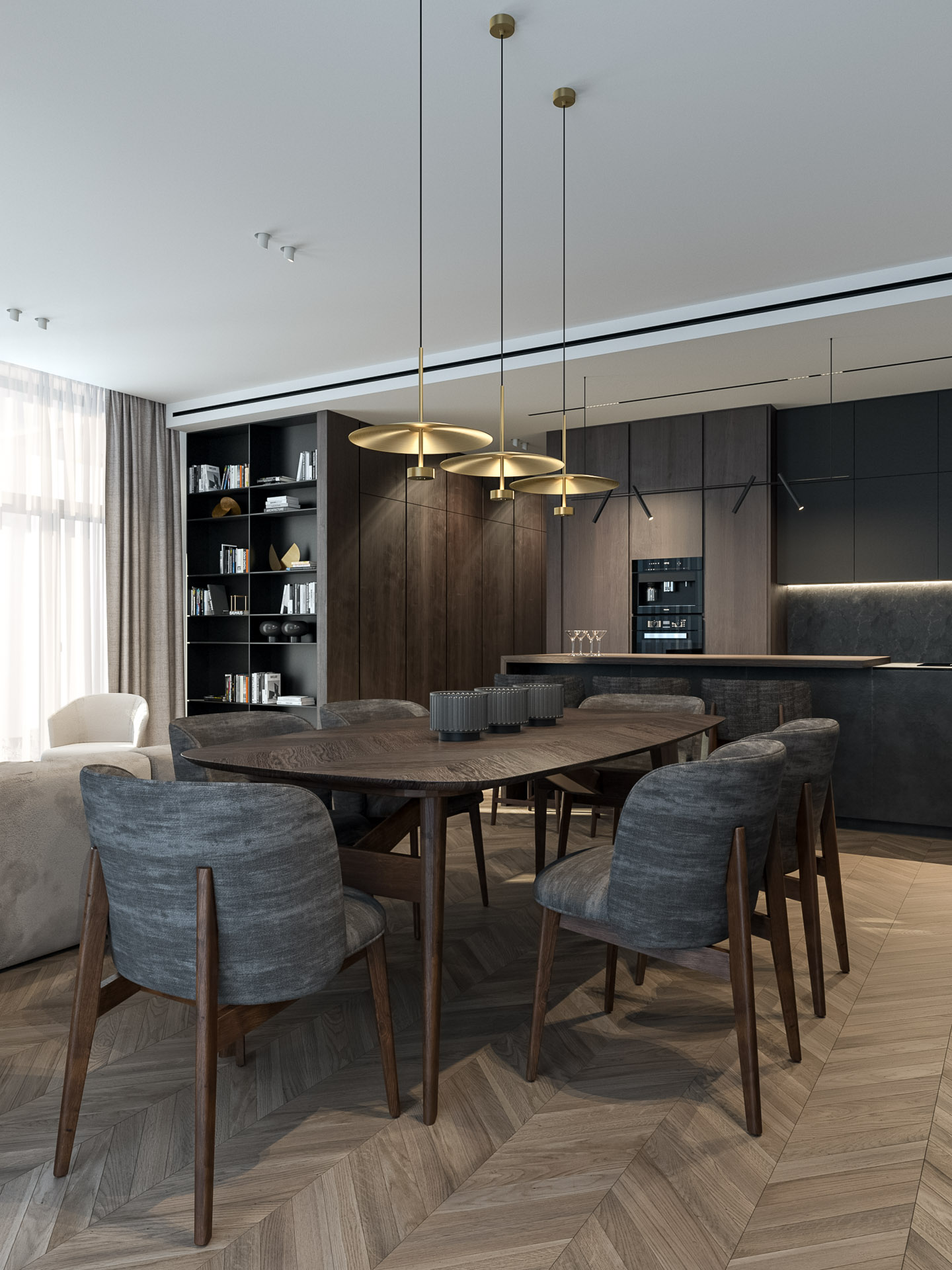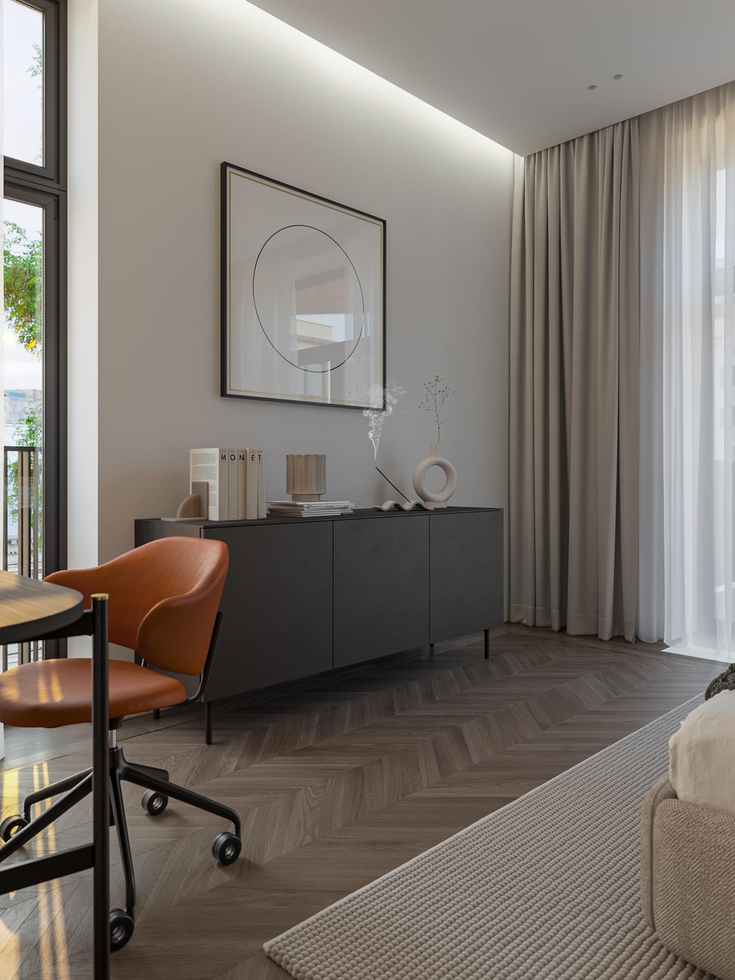 The apartment's interior design embraces a play of contrasting colors, with accentuated wall panels featuring natural veneer finishes. The textile elements remain solid-toned, allowing the designer furniture and meticulous selection of finishing materials to take center stage. The integration of built-in furniture seamlessly blends with the overall aesthetic, while the kitchen and hallway cabinets appear monolithic and harmonize with the surrounding walls. Attention to detail was given to the quality of designer furniture and the careful selection of interior elements.